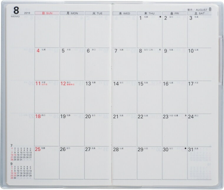 ・20180822・カテゴリー ・分類 :ビジネス手帳>マンスリー>月間式(月間ブロック)・分類 :サイズで探す>ビジネス手帳>A6サイズ・分類 :ブランド名で探す>高橋手帳(TAKAHASHI)>ビジネス手帳・分類 :デザインで探す>ビジネス手帳>ビジネス定番手帳・分類 :用途・機能で探す>ビジネス手帳>ビジネス定番手帳クリアカバータイプで日曜始まりと土日均等スペースが人気!軽くて薄くて持ち歩きに便利1ヵ月の予定がひと目でわかる優れもの。